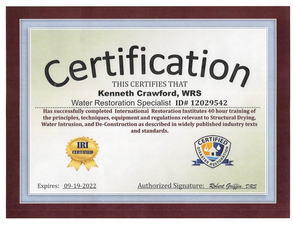This Certification certifies that Kenneth Crawford, WRS (Water Restoration Specialist) has successfully completed the international Restoration Institute’s 40 Hour Training of the principles, techniques, equipment, and regulations relevant to Structural Drying, Water Intrusion, and De-Construction as described in widely published industry texts and standards.