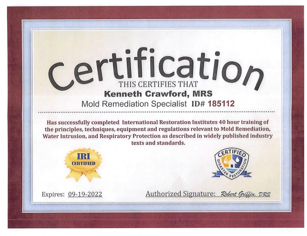 This Certification certifies that Kenneth Crawford, MRS (Mold Remediation Specialist) has successfully completed the international Restoration Institute’s 40 Hour Training of the principles, techniques, equipment, and regulations relevant to Mold Remediation, Water Intrusion, and Respiratory Protection as described in widely published industry texts and standards.