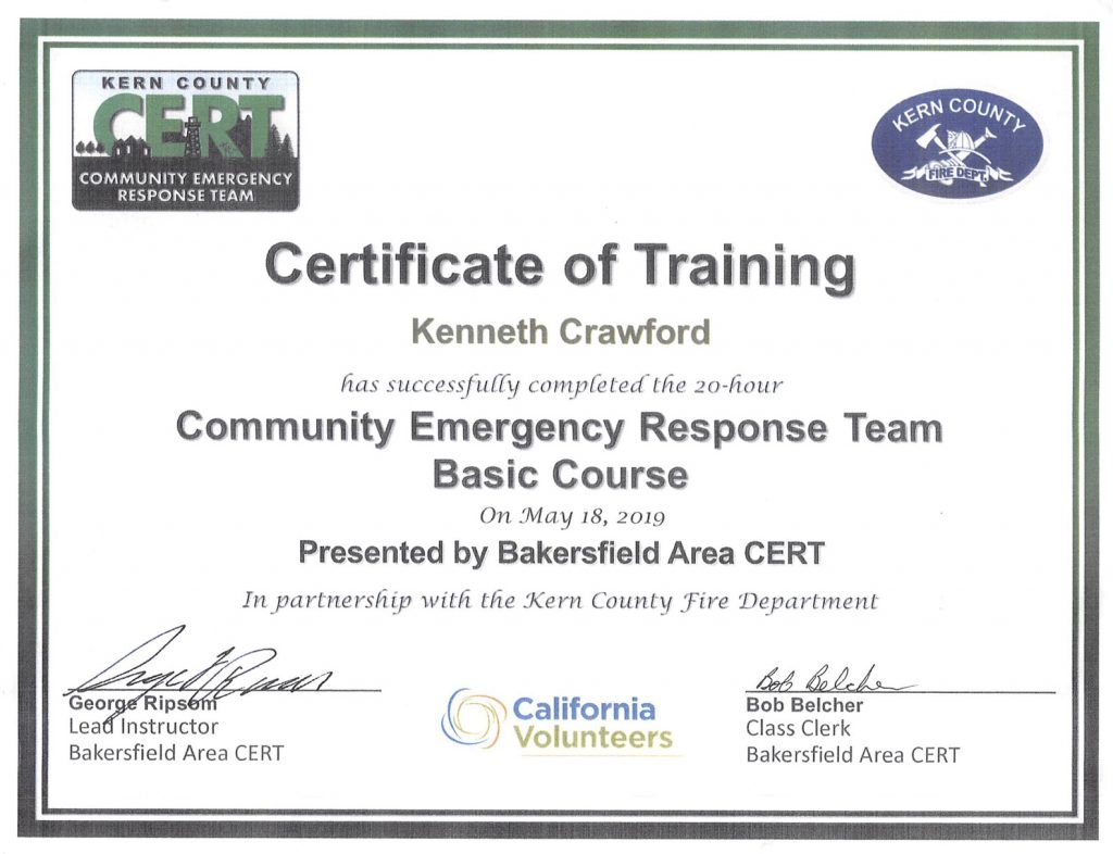 This Certification certifies that Kenneth Crawford has successfully completed the 20-Hour Community Emergency Response Team Basic Course Presented by Bakersfield Area CERT in Partnership with the Kern County Fire Department.